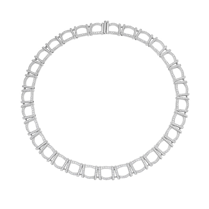 Square Links converge in 18K white gold adorned with pave diamonds to form this show-stopping wreath necklace. Reaching a new level of complexity and craftsmanship, this piece showcases the entire year Carelle's skilled artisans worked to perfect its form, fit and scale.