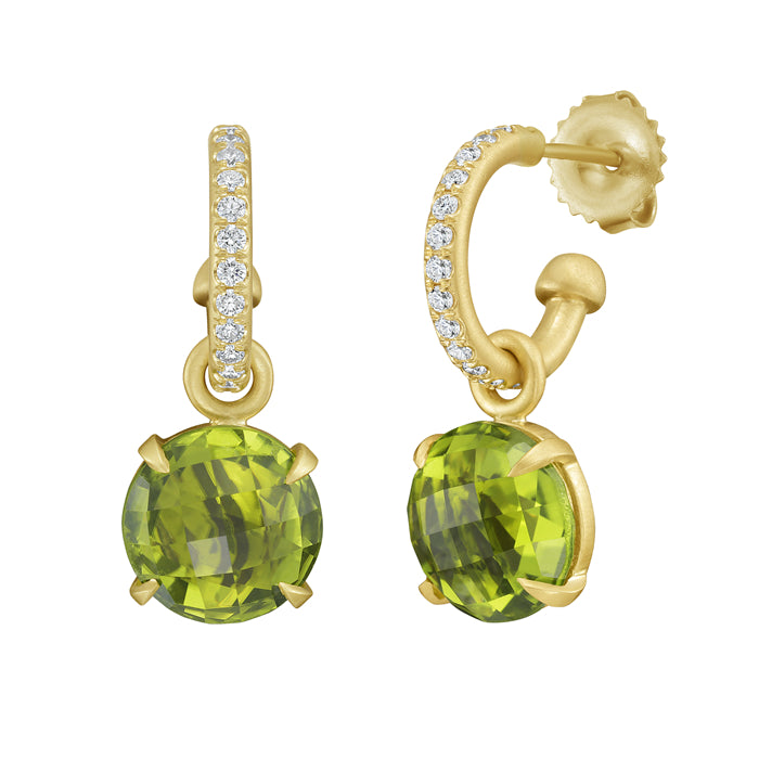 A new twist on the diamond hoop, both fabulous and functional, accommodates multiple styles for those who like to mix it up and pile it on. Available with Amethyst and Peridot Charms. Charms are removeable, for two styles.