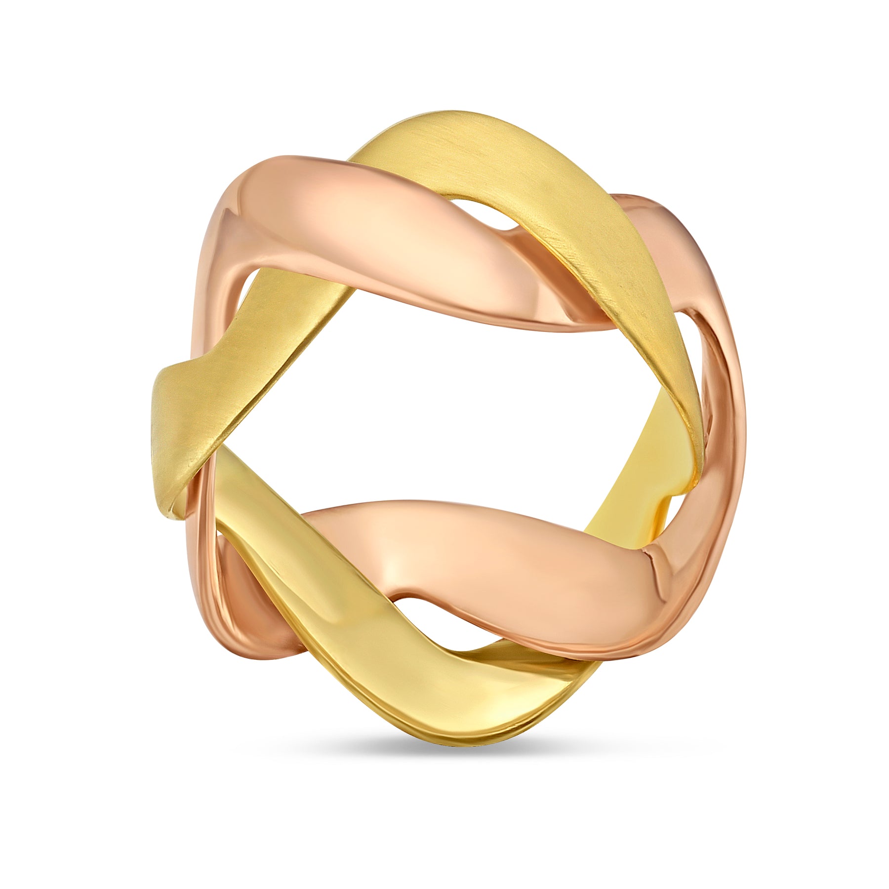 The Whirl Large two-tone band features one satin finished 18 karat yellow gold band intertwines with another high polished 18 karat rose gold band encircling the finger for around the clock glamour.