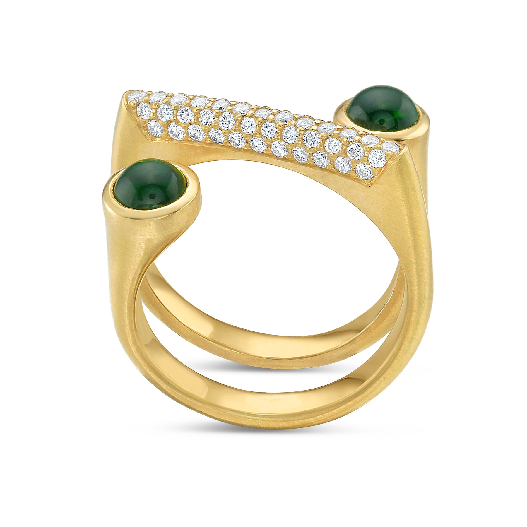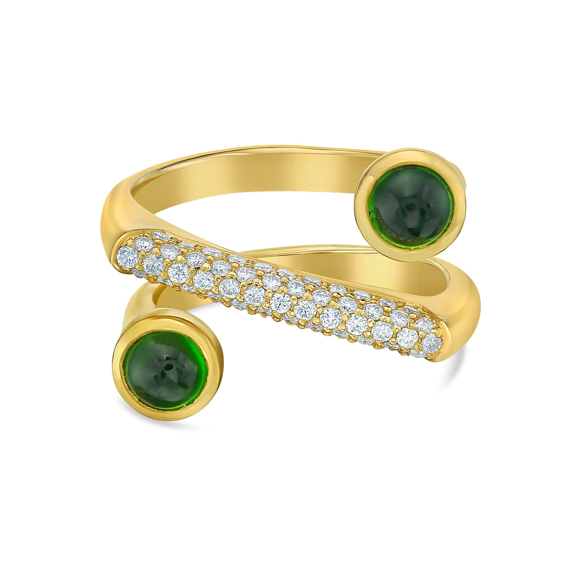 This 18-karat yellow gold spotlight ring encircles the finger, showcasing two standout cabochon Tsavorites and pave diamonds.